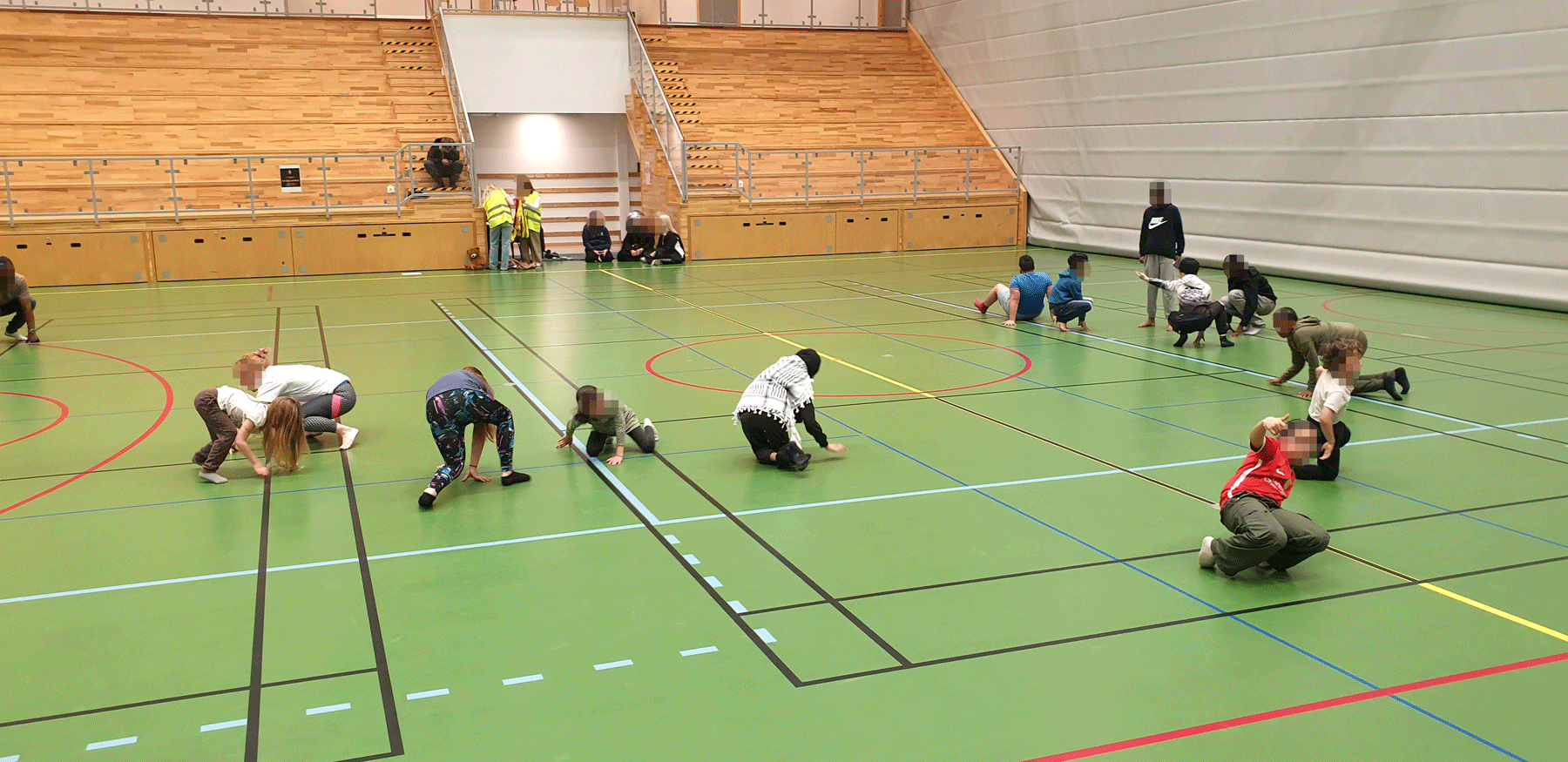 Two facilitators hosted an indoor play session with around 40 participants. The children were especially enthusiastic, while adults joined in more slowly but eventually some got involved. Familiar games such as Datten, Följa John, and Svansleken were played alongside new variations of these games and games invented by the group. Older boys also joined in, adding to the playful energy of the day.